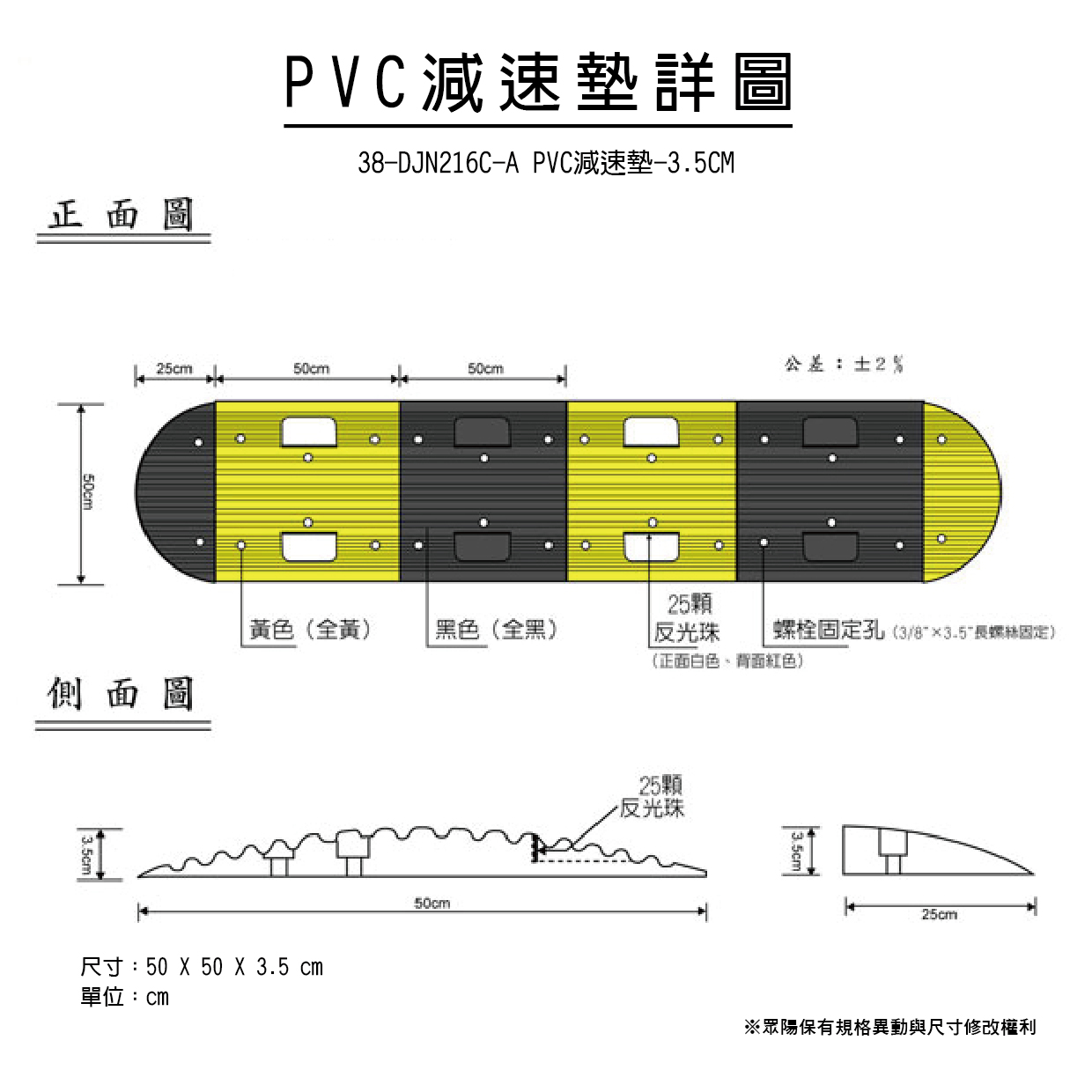 減速墊為PVC材質(zhì),目前只提供 2.5cm/3.5cm/5.0cm的厚度, 不同的厚度,提供客戶依照需求進(jìn)行選擇。